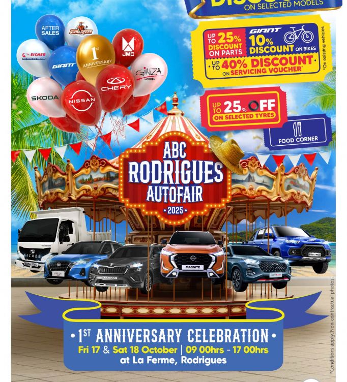 La Ferme, 10 octobre 2025 - ABC Automobile Rodrigues, filiale du Groupe ABC, souffle sa première bougie. À cette occasion, l’entreprise organise, en collaboration avec la Maubank, la première édition d’ABC Rodrigues Autofair, les 17 et 18 octobre 2025 au showroom d’ABC Automobile Rodrigues à La Ferme. Cet événement offre au public rodriguais une occasion unique de découvrir des offres exclusives sur les marques représentées par le concessionnaire, tout en bénéficiant de conditions de leasing particulièrement avantageuses.